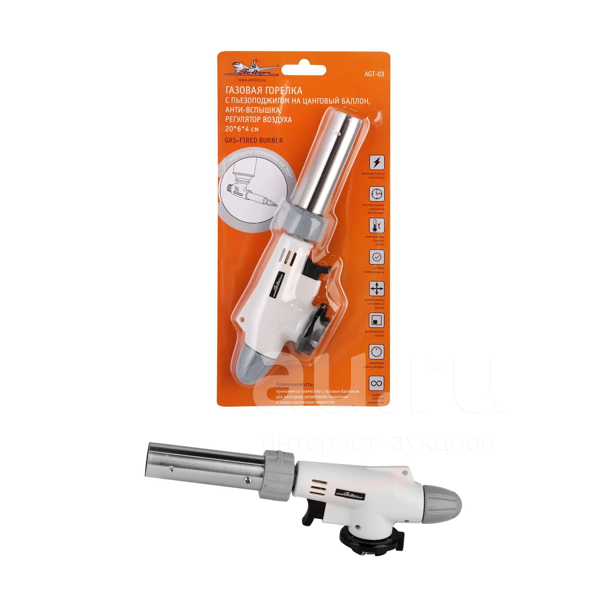 Горелка газовая с пьезоподжигом на цанговый баллон, анти-вспышка, регулятор воздуха, 20*6*4 с AIRLINE AGT03